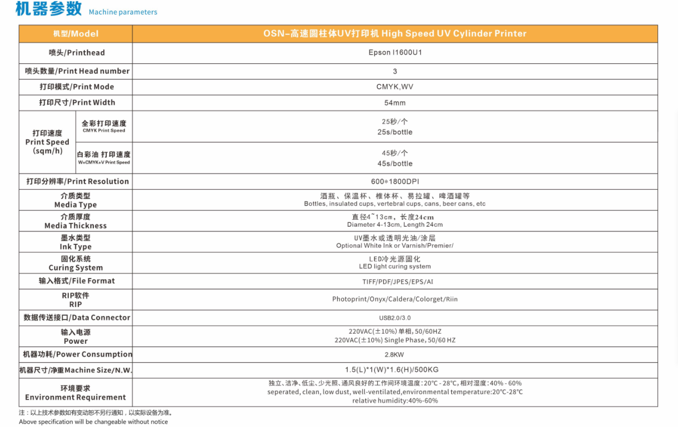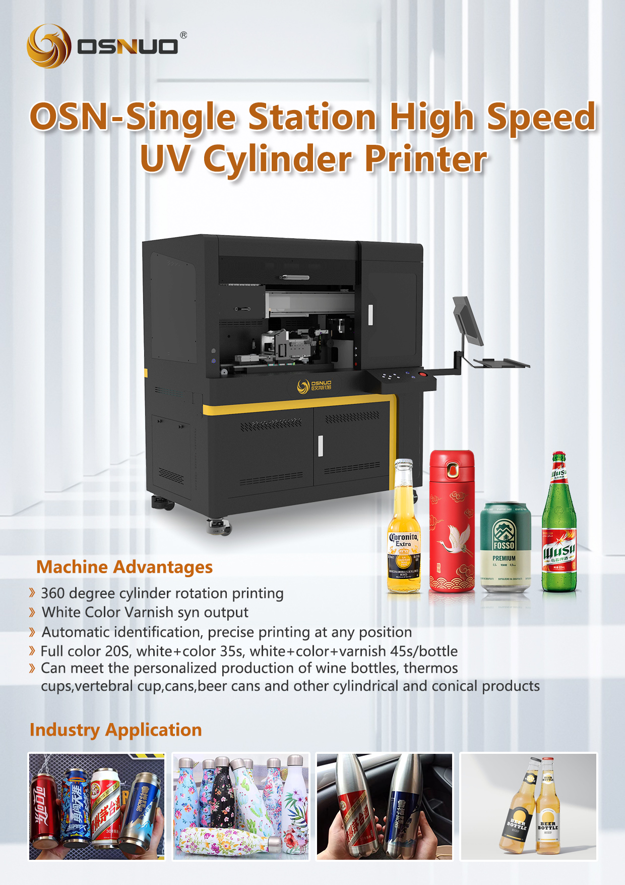The OSN-High Speed UV Printing Cylinder Machine is an advanced, high-speed printing solution specifically designed for decorating cylindrical objects such as wine bottles and beverage cans. Equipped with the EPSON i1600U1 printhead, it achieves a printing width of 54mm, delivering exceptional precision and efficiency. When printing in CMYK, it operates at a speed of 25 seconds per item, while the W+CMYK+V mode takes 45 seconds per item.